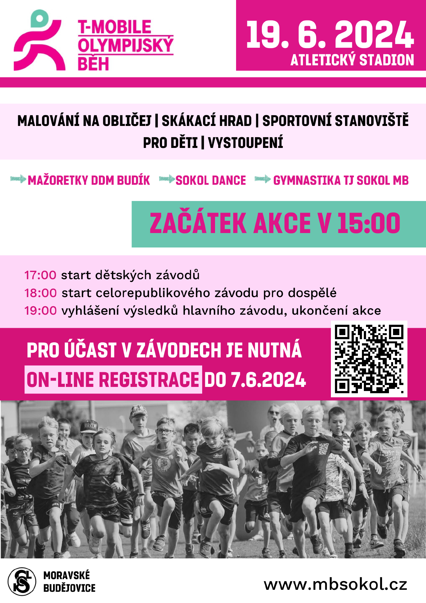 Letos se opět podílíme na pořádání celorepublikového T-Mobile Olympijského běhu, který se bude konat 19. června 2024 na atletickém stadionu. Dopoledne bude patřit školním běhům, odpolední program bude, kromě hlavního závodu, patřit dětem. Připraveny budou sportovní stanoviště s úkoly, malování na obličej, výtvarné dílničky. Program svým vystoupením zpestří dívky z moravskobudějovického sokola.