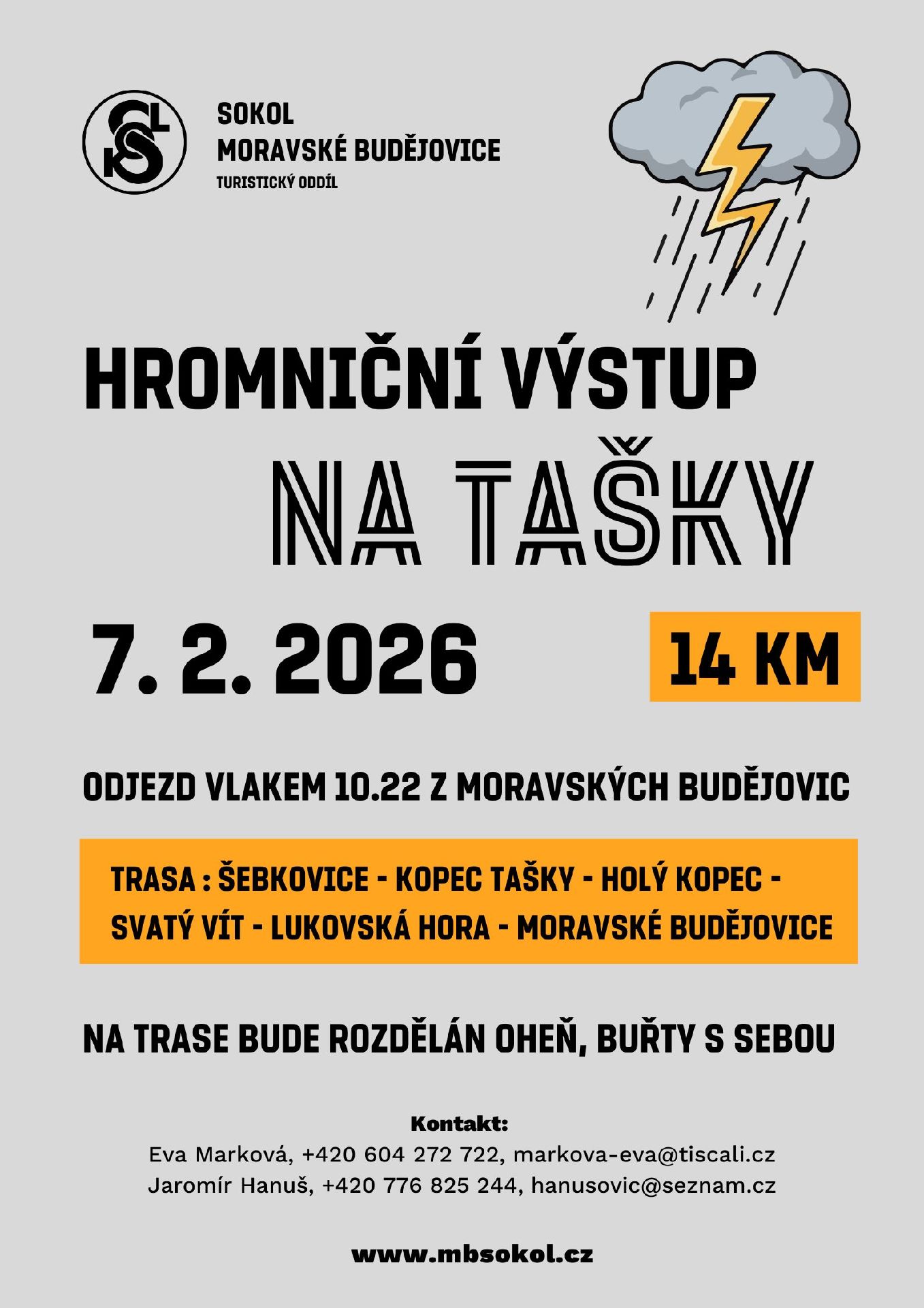 Turistický oddíl zve všechny příznivce na Hromniční výstup na Tašky, který se uskuteční v sobotu 7. 2.2026. Sraz účastníků je v 10.15 hodin na vlakovém nádraží.