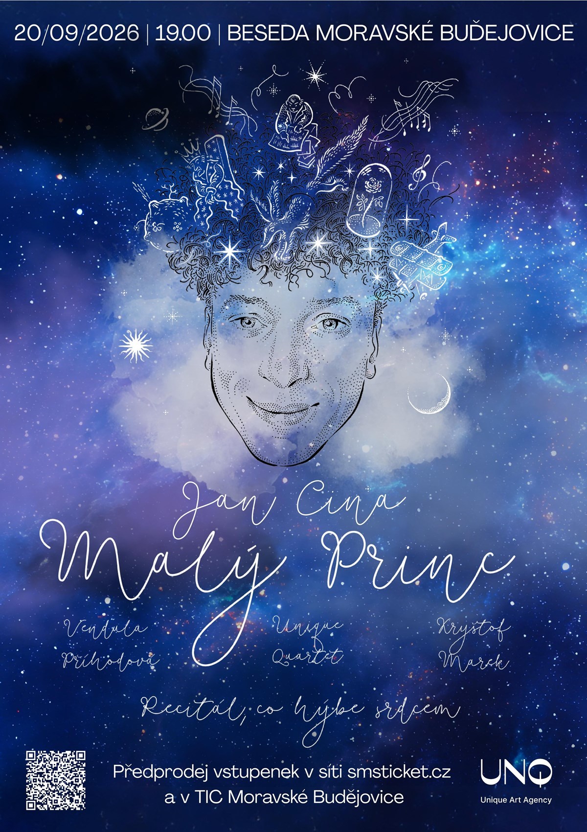 Naše ztvárnění není klasickým vyprávěním příběhu Malého prince. Je to originální spojení hudby a slova, které divákovi umožní oddat se své fantazii a pohladí ho na duši. V recitálu exceluje známý herec Jan Cina, který nás provede kouzelným světem, kde vše, co je důležité, je očím neviditelné. Spolu se zpěvačkou Vendulou Příhodovou / Kateřinou Bohatovou představí původní písně od Kryštofa Marka za doprovodu smyčcového kvarteta Unique Quartet a piana. Představení je vhodné pro diváky všech věkových kategorií.