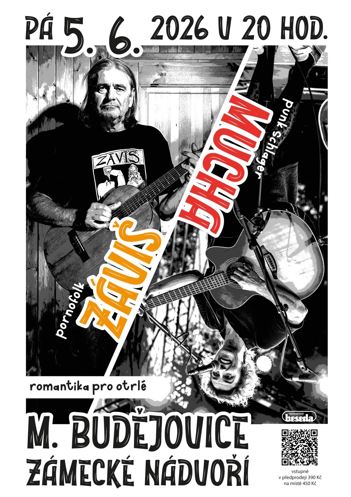 Brány a výčep se otevírají v 19:00. Mucha 20:30, Záviš 22:00