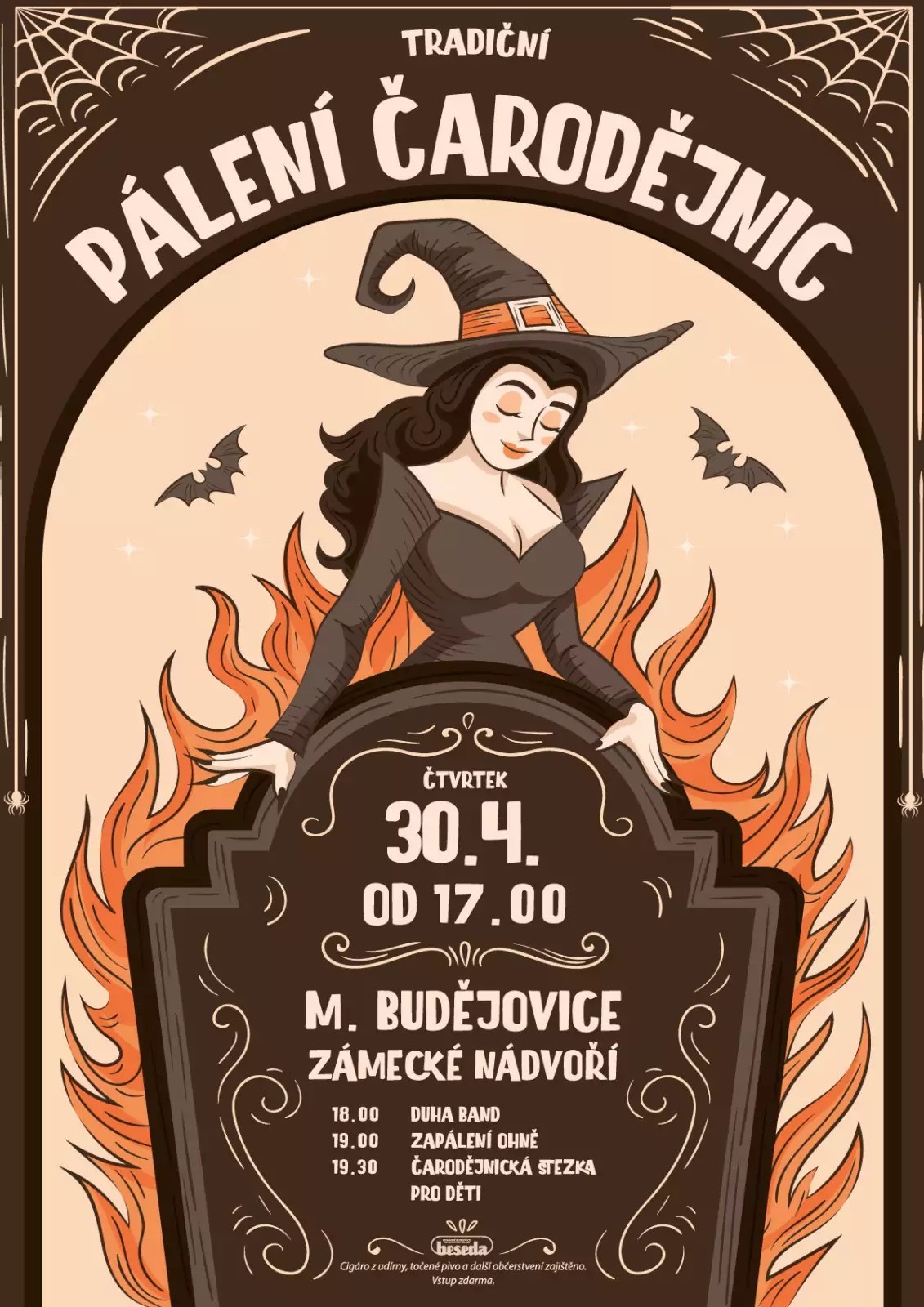 Od 18 hodin hraje k tanci a poslechu skupina Duha Band. V 19 hodin zapálení ohně. Od 20 hodin Čarodějnická stezka pro děti. Cigáro z udírny, točené pivo, limo a další občerstvení. Vstup zdarma.