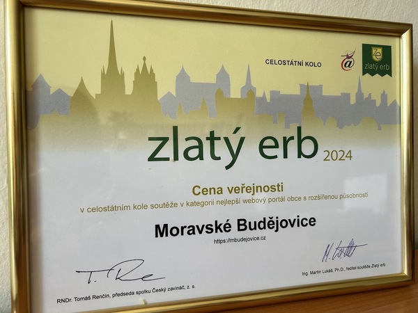 Na konferenci ISSS 2024 o digitalizaci státní správy a samosprávy v královéhradeckém Kongresovém centru Aldis byly 13. května na slavnostním galavečeru vyhlášeny výsledky celostátního kola Zlatého erbu, soutěže o nejlepší webové stránky. Letos se konal již 26. ročník, ve kterém se hodnotilo ve dvanácti krajích celkem 287 obcí, z toho pak 168 obcí s rozšířenou působností. V kategorii nejlepší webový portál obce s rozšířenou působností zvítězila Plzeň, druhý byl Liberec a třetí skončily Karlovy Vary. Za obce, které nemají rozšířenou působnost, se jako první umístila obec Poděšín z Kraje Vysočina, druhé bylo město Bystřice ze Středočeského kraje a třetí obec Mnetěš z Ústeckého kraje. Moravské Budějovice obhájily vítězství z krajského kola a radní Tomáš Veverka převzal na zmíněné konferenci „Cenu veřejnosti za nejlepší webový portál v celostátním kole“.