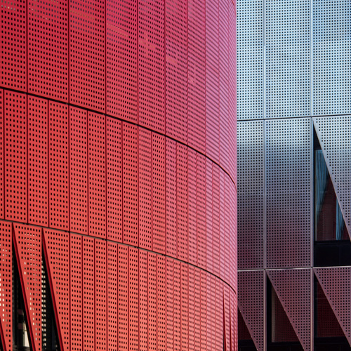 Fasáda z perforovaných červených hliníkových panelů a její ostnatá koruna se ve večerních hodinách rozsvítí a promění tak obvod arény ve světelný prstenec, který odráží atmosféru událostí uvnitř a vytváří vizuální dialog s městem.