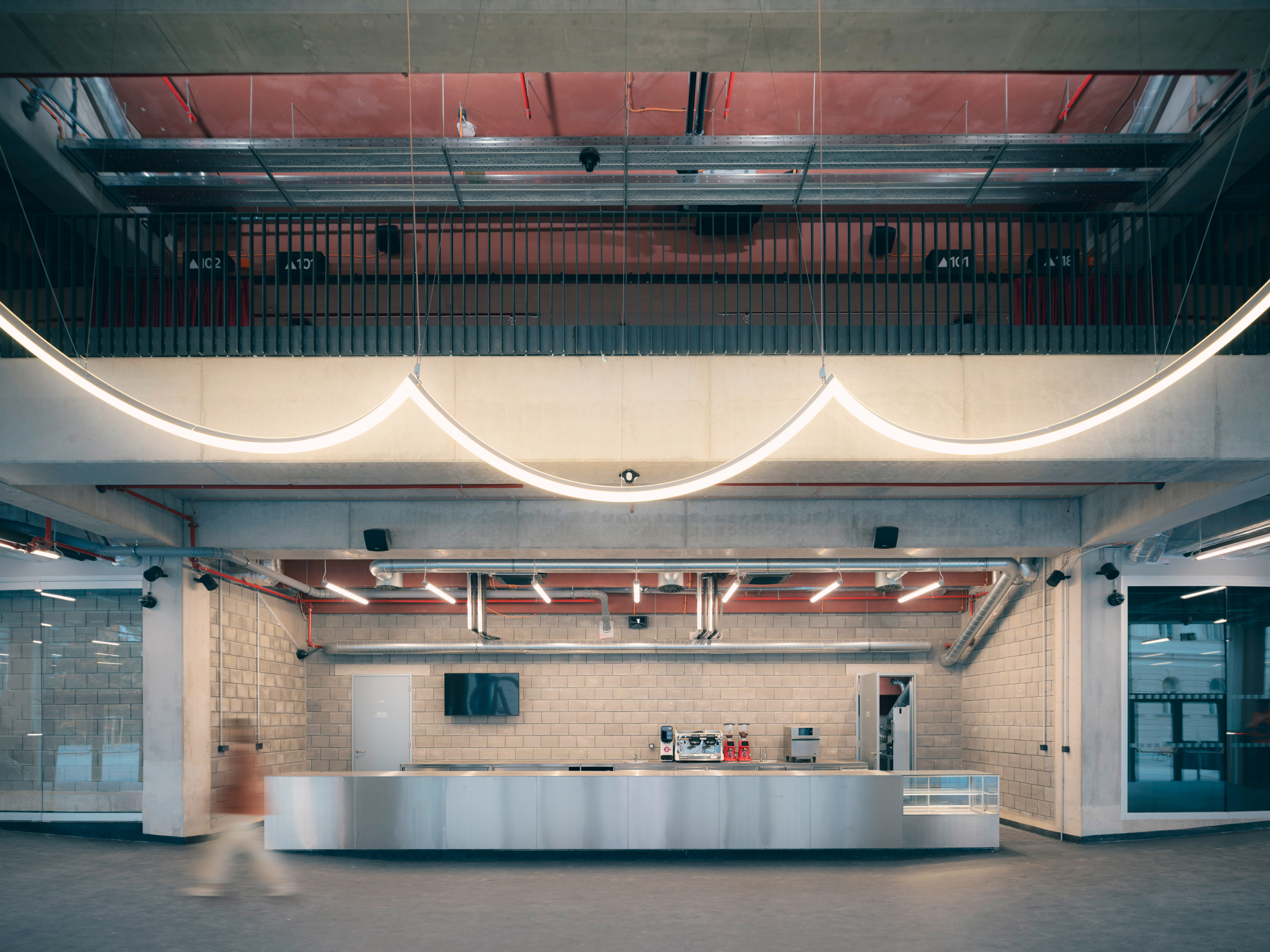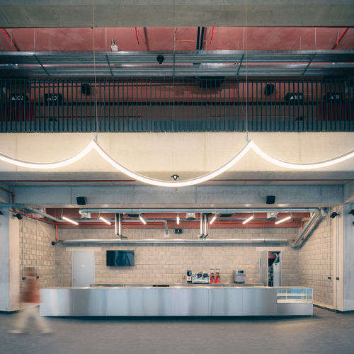 Rozdělení funkcí arény mezi dva nové objemy — hlavní halu a nárožní budovu — bylo klíčové k tomu, aby stavba žila i mimo zápasy. Hlavní podlaží arény zůstává vizuálně propojeno s okolím díky prosklenému parteru, zatímco nárožní budova s rovněž prosklenou restaurací a fanshopem, ubytováním, posilovnou a tělocvičnou zajišťuje každodenní provoz.